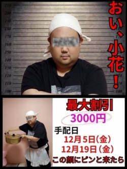 | コメント | 令和の鼠小僧! カロリーを愛し! カロリーに愛された男! その名も!『おい、小花!』 今までは、 極悪同盟幹部 【軽トラのだっち】の給料日を 狙う生活を送っていたが 深刻なカロリー不足から 我らがHip's春日部店の 金庫泥棒を計画している! 『おい、小花!』手配の日 12月5日 (金) 12月19日(金) 奴は12月中の 二日間だけ現れるのである! 事態を重く考えた 【軽トラのだっち】は 金庫のお金を無くす為 善良な市民の方々に 還元する事を決定。 =========== 12月5日 (金) 12月19日(金) 『おい、小花!』手配の日! ・電話予約 (タウンネット予約・ヘブンネット予約) 全コース 2000円OFF ・オフィシャルメンバー会員 (オフィシャルHP・WEB予約) 全コース 3000円OFF ※すべての割引併用不可 ※ポイント使用不可 ※ポイント付与 3% ※メルマガ会員様のみ+10分可能 =========== ↓会員登録はコチラ(初回登録2000P付与)↓ https://7003-hips-web.cs-user.com/hips/kasukabe/regist.html ↓既に会員の方はコチラ↓ https://7003-hips-web.cs-user.com/hips/kasukabe/ =========== 【軽トラのだっち】が守り抜けるのか? 『おい、小花!』がカロリーを奪取するのか? 皆でカロリーを守り抜け!! |