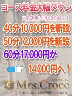 | コメント | 日頃の皆様の熱いご愛顧に答えましてこのたび、大幅な料金改定を断行いたしました! もちろん、女性の質はそのままに全てのコースが大幅値下げとなっており、大変ご利用しやすくなっております! また、ご要望の多かった短いコース(40分、50分)も併せて新設しておりますので、今まで以上のご愛顧よろしくお願いいたします。 |